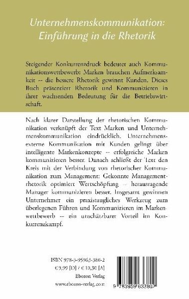 Steigender Konkurrenzdruck bedeutet auch Kommunikationswettbewerb: Marken brauchen Aufmerksamkeit -- die bessere Rhetorik gewinnt Kunden. Dieses Buch präsentiert Rhetorik und Kommunizieren in ihrer wachsenden Bedeutung für die Betriebswirtschaft.Nach klarer Darstellung der rhetorischen Kommunikation verknüpft der Text Marken und Unternehmenskommunikation eindrücklich. Unternehmensexterne Kommunikation mit Kunden gelingt über intelligente Markenkonzepte -- erfolgreiche Marken kommunizieren besser. Danach schließt der Text den Kreis mit der Verbindung von rhetorischer Kommunikation zum Management: Gekonnte Managementrhetorik optimiert Wertschöpfung -- herausragende Manager kommunizieren besser. Insgesamt gewinnen Unternehmer ein praxistaugliches Werkzeug zum überlegenen Führen und Kommunizieren im Markenwettbewerb -- ein unschätzbarer Vorteil im Konkurrenzkampf.