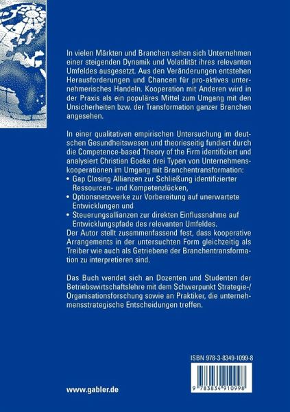 In einer qualitativen empirischen Untersuchung im deutschen Gesundheitswesen und theorieseitig fundiert durch die Competence-based Theory of the Firm identifiziert und analysiert Christian Goeke drei Typen von Unternehmenskooperationen im Umgang mit Branchentransformation: