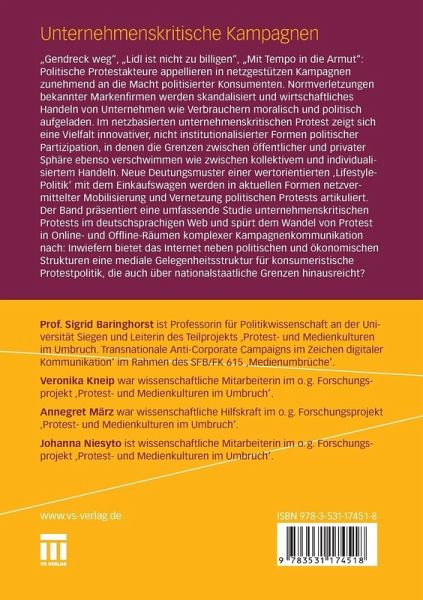 "Gendreck weg", "Lidl ist nicht zu billigen", "Mit Tempo in die Armut": Politische Protestakteure appellieren in netzgestützen Kampagnen zunehmend an die Macht politisierter Konsumenten. Normverletzungen bekannter Markenfirmen werden skandalisiert und wirtschaftliches Handeln von Unternehmen wie Verbrauchern moralisch und politisch aufgeladen. Im netzbasierten unternehmenskritischen Protest zeigt sich eine Vielfalt innovativer, nicht institutionalisierter Formen politischer Partizipation, in denen die Grenzen zwischen öffentlicher und privater Sphäre ebenso verschwimmen wie zwischen kollektivem und individualisiertem Handeln. Neue Deutungsmuster einer wertorientierten 'Lifestyle-Politik' mit dem Einkaufswagen werden in aktuellen Formen netzvermittelter Mobilisierung und Vernetzung politischen Protests artikuliert. Der Band präsentiert eine umfassende Studie unternehmenskritischen Protests im deutschsprachigen Web und spürt dem Wandel von Protest in Online- und Offline-Räumen komplexer Kampagnenkommunikation nach: Inwiefern bietet das Internet neben politischen und ökonomischen Strukturen eine mediale Gelegenheitsstruktur für konsumeristische Protestpolitik, die auch über nationalstaatliche Grenzen hinausreicht?