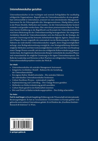 Unternehmenskultur gilt als wichtigster und zentraler Erfolgsfaktor für langfristig erfolgreiche Organisationen. Dennoch setzen sich Unternehmen noch zu wenig mit ihr auseinander. An dieser Stelle setzt Josef Herget an. Mit diesem Buch vermittelt er Ihnen Wissen und Kompetenzen, mit denen Sie eine zukunftsfähige Unternehmenskultur gestalten und implementieren. Hierfür gibt er Ihnen praxisrelevante Werkzeuge an die Hand: