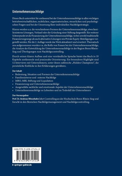 Hierzu werden u.a. die verschiedenen Formen der Unternehmensnachfolge, etwa familieninterne Lösungen, Verkauf oder die Gründung einer Stiftung dargestellt. Ein weiterer Schwerpunkt ist die Finanzierung der Unternehmensnachfolge, wobei sowohl traditionelle Finanzierungswege als auch alternative Lösungen wie Private Equity-Beteiligungen vorgestellt werden. Für die 2. Auflage wurde das Werk aktualisiert und erweitert. Thematisch neu aufgenommen wurden v.a. die Rolle von Frauen bei der Unternehmensnachfolge, die Analyse der Entwicklung der Unternehmensnachfolge in der Region Bonn/Rhein-Sieg und Überlegungen zum Nachfolgecontrolling.