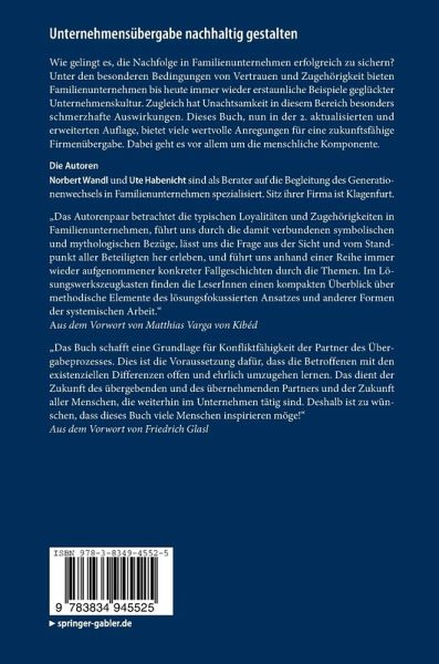 Norbert Wandl Dipl.-Ing., Studium der Landschaftsökologie an der Universität für Bodenkultur in Wien. Langjährige Erfahrung im Führungs- und Trainingsbereich bei österreichischen Beraterfirmen und im Bereich Regionalentwicklung. Unternehmensberater, Wirtschaftstrainer, Lebens- und Sozialberater. Landessprecher der Übergabeconsultants der Wirtschaftskammer Kärnten. Ausbildungen in Organisationsentwicklung, Gruppendynamik, systemischer Organisationsberatung und Systemischen Strukturaufstellungen. Ute Habenicht Studium der Japanologie in Wien und Paris. Geschäftsführerin der Schmuck & Uhren Ute Habenicht GmbH, Familienunternehmen in der dritten Generation. Ausgezeichnet für frauen- und familienfreundliche Firmenpolitik und mit dem Staatspreis "Bester Lehrbetrieb Österreichs 2008". Mitgründerin und Beraterin der Diadoro-Juweliersgruppe, Unternehmensberaterin. Ausbildungen in Unternehmensführung, Coaching, systemischer Organisationsberatung und Systemischen Strukturaufstellungen. Gemeinsam betreiben die beiden Autoren die Firma WANDeLBERATUNG, die sich auf die Begleitung des Generationenwechsels in Familienunternehmen und auf Systemische Strukturaufstellungen im Businessbereich spezialisiert hat.