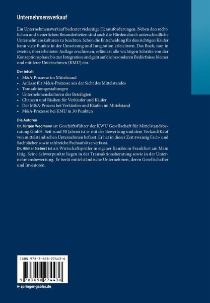 Ein Unternehmensverkauf bedeutet vielseitige Herausforderungen. Neben den rechtlichen und steuerlichen Besonderheiten sind auch die Hürden durch unterschiedliche Unternehmenskulturen zu beachten. Schon die Entscheidung für den richtigen Käufer kann viele Punkte in der Umsetzung und Integration erleichtern. Das Buch, nun in zweiter, überarbeiteter Auflage erschienen, erläutert alle wichtigen Schritte von der Konzeptionsphase bis zur Integration und geht auf die besonderen Bedürfnisse kleiner und mittlerer Unternehmen (KMU) ein.