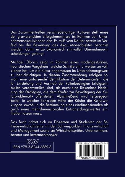 Das Zusammentreffen verschiedenartiger Kulturen stellt eines der gravierendsten Erfolgshemmnisse im Rahmen von Unternehmensakquisitionen dar. Es muß vom Käufer bereits im Vorfeld bei der Bewertung des Akquisitionsobjektes beachtet werden, damit er zu ökonomisch sinnvollen Übernahmeentscheidungen gelangt. Michael Olbrich zeigt im Rahmen eines modellgestützten, heuristischen Vorgehens, welche Schritte ein Erwerber zu vollziehen hat, um die Kultur angemessen im Unternehmungswert zu berücksichtigen. In diesem Zusammenhang erfolgen sowohl eine umfassende Identifikation der Determinanten, die für Entstehung und Ausmaß der kulturbedingten Erfolgseinbußen verantwortlich sind, als auch eine lückenlose Herleitung der Strategien, die dem Käufer zur Bewältigung der Kulturproblematik offenstehen. Abschließend wird herausgearbeitet, in welcher konkreten Höhe der Käufer die Kulturwirkungen sowohl in die Bestimmung eines eindimensionalen als auch eines mehrdimensionalen Entscheidungswertes einfließen lassen muss.