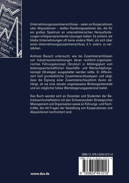 Andreas Bausch untersucht, wie bei Zusammenschlüssen von Industrieunternehmungen deren rechtlich-organisatorisches Führungskonzept (Struktur) in Abhängigkeit vom leistungswirtschaftlichen Geschäfts- und Wertschöpfungskonzept (Strategie) ausgestaltet werden sollte. Er differenziert fünf grundsätzliche Zusammenschlusstypen und zeigt, dass die Eignung einer Zusammenschlussform davon abhängt, ob sie eine situativ angemessene Bindungsintensität und ein möglichst hohes Wertsteigerungspotenzial bietet.