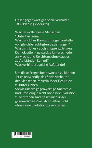 Unser gegenwärtiges Sozialverhalten ist erklärungsbedürftig. Warum wollen viele Menschen "Untertan" sein? Warum gibt es Rangordnungen anstelle von gleichberechtigten Beziehungen? Warum gibt es - auch in gegenwärtigen Demokratien - gewaltige Unterschiede an Macht und Reichtum, ohne dass es zu Aufständen kommt? Was verhindert solche Aufstände? Um diese Fragen beantworten zu können ist es notwendig, das Sozialverhalten der Menschen im Verlauf der Evolution zu untersuchen. So wie unsere gegenwärtige Anatomie und Physiologie nicht ohne ihre Evolution zu verstehen sind, so ist auch unser gegenwärtiges Sozialverhalten nicht ohne seine Evolution zu verstehen.