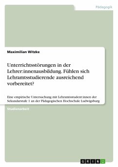 Studienarbeit aus dem Jahr 2025 im Fachbereich Pädagogik - Der Lehrer / Pädagoge, Note: 1,0, Pädagogische Hochschule Ludwigsburg (Institut für Erziehungswissenschaften), Veranstaltung: Unterrichtsstörungen und erzieherisches Handeln, Sprache: Deutsch, Abstract: Das Ziel der Arbeit ist es herauszufinden, ob sich Studierende der Sekundarstufe 1 an der PH Ludwigsburg für den Umgang mit Unterrichtsstörungen ausreichend vorbreitet fühlen. Zudem möchte die vorliegende Arbeit erheben, ob der Besuch von Seminaren zum Thema Unterrichtsstörungen einen Einfluss auf die gefühlte Vorbereitung der Studierenden hat. Um die Fragestellung der Arbeit fundiert beantworten zu können, sollen zunächst die theoretischen Grundlagen zur Thematik vorgestellt werden. Dazu wird auf verschiedene Arten und Ursachen von Unterrichtsstörungen sowie auf Möglichkeiten Umgang mit ebendiesen eingegangen. Weiterhin werden die daraus resultierenden Anforderungen an Lehrkräfte thematisiert. Anschließend wird die Lehrer:innenbildung für die Sekundarstufe 1 an der Pädagogischen Hochschule Ludwigsburg betrachtet, wobei sowohl der Aufbau des Studiums als auch konkrete Inhalte zum Thema Unterrichtsstörungen ausgemacht werden. Im empirischen Teil der Arbeit soll dann eröffnen, ob und inwiefern sich Studierende der Sekundarstufe 1 an der PH Ludwigsburg für den Umgang mit Unterrichtsstörungen vorbereitet fühlen. Die gewonnen Erkenntnisse werden dann zur Diskussion gestellt und es wird aus dem Erarbeiteten ein abschließendes Fazit gezogen.