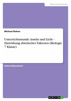 Unterrichtsentwurf aus dem Jahr 2012 im Fachbereich Biologie - Ökologie, Note: 1,7, Studienseminar für Lehrämter an Schulen Dortmund, Sprache: Deutsch, Abstract: Unterrichtsentwurf im Fach Biologie nach den neusten Vorgaben in NRW (Stand: 01/2013). Thema: "Asseln und Licht" - Versuchsbasierte Erarbeitung des Einflusses des abiotischen Faktors Licht auf Asseln, um das Verständnis der Einwirkung selbiger auf Lebewesen zu verdeutlichen.Der Entwurf enthält:- Themenformulierungen für die gesamte Reihe plus dazugehörige Kompetenzen- Lernziele- Didaktische Reflexion der längerfristigen Unterrichtszusammenhänge- Didaktik sowie Methodik der Stunde- Lernausgangslage- Legitimation- Verlaufsplan- Einstieg- Quellen- Konkretes Material + ZusatzmaterialStundenverlauf war sehr gut.