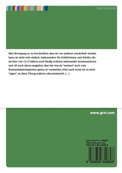 Unterrichtsentwurf aus dem Jahr 2011 im Fachbereich Germanistik - Didaktik, Note: 1,7, Studienseminar für Gymnasien Wiesbaden, Sprache: Deutsch, Abstract: Eine Bewegung so zu beschreiben, dass sie von anderen wiederholt werden kann, ist nicht sehr einfach. Insbesondere für Schülerinnen und Schüler, die im Alter von 13-15 Jahren auch häufig verkürzt miteinander kommunizieren und oft noch davon ausgehen, dass das was sie "meinen" auch vom Kommunikationspartner genau so verstanden wird, auch wenn sie es nicht "sagen", ist diese Übung äußerst erkenntnisreich. Gemeinsam erstellen die Schüler Beschreibungen von Sportübungen für einen Sportparcours auf dem Schulhof und probieren dabei immer wieder nur aufgrund der Beschreibung auch die Übung auszuführen. Es entsteht eine Art "Stille Post", die den Schülern vor Augen führt, wie präzise sie kommunizieren müssen, um sich exakt verständlich zu machen. Sprachlich überarbeiten sie ihre Anleitungen mit einer Überprüfungscheckliste in einer Schreibkonferenz. Auf diesem Weg erfahren sie Schreiben als Prozess, zu dem auch Überarbeitungsphasen und gegenseitige Hilfestellung gehören. Die Ergebnisse der Unterrichtsreihe gewannen den 1. Preis des Schülerwettbewerbs "Eine Klasse besser".
