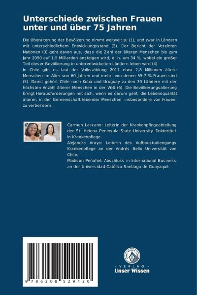 Die Überalterung der Bevölkerung nimmt weltweit zu (1), und zwar in Ländern mit unterschiedlichem Entwicklungsstand (2). Der Bericht der Vereinten Nationen (3) geht davon aus, dass die Zahl der älteren Menschen bis zum Jahr 2050 auf 1,5 Milliarden ansteigen wird, d. h. um 34 %, wobei ein großer Teil dieser Bevölkerung in unterentwickelten Ländern leben wird (4).In Chile gibt es laut der Volkszählung 2017 etwa 2,8 Millionen ältere Menschen im Alter von 60 Jahren und mehr, von denen 55,7 % Frauen sind (5). Damit gehört Chile nach Kuba und Uruguay zu den 30 Ländern mit der höchsten Anzahl älterer Menschen in der Welt (6). Die Bevölkerungsalterung bringt Herausforderungen mit sich, wenn es darum geht, die Lebensqualität älterer, in der Gemeinschaft lebender Menschen, insbesondere von Frauen, zu verbessern.