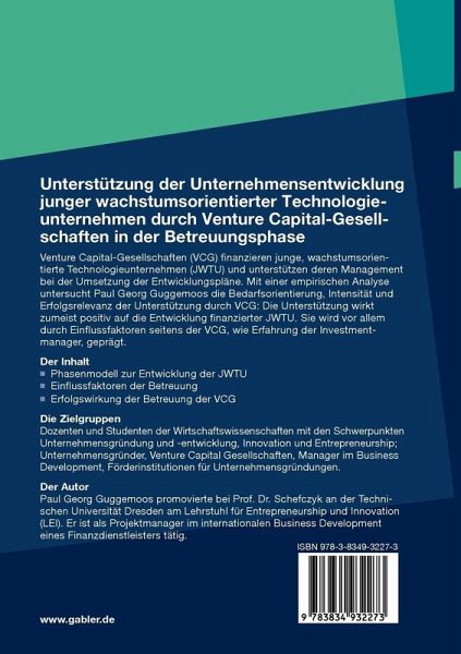 Venture Capital-Gesellschaften (VCG) finanzieren junge, wachstumsorientierte Technologieunternehmen (JWTU) und unterstützen deren Management bei der Umsetzung der Entwicklungspläne. Mit einer empirischen Analyse untersucht Paul Georg Guggemoos die Bedarfsorientierung, Intensität und Erfolgsrelevanz der Unterstützung durch VCG: Die Unterstützung wirkt zumeist positiv auf die Entwicklung finanzierter JWTU. Sie wird vor allem durch Einflussfaktoren seitens der VCG, wie Erfahrung der Investmentmanager, geprägt.