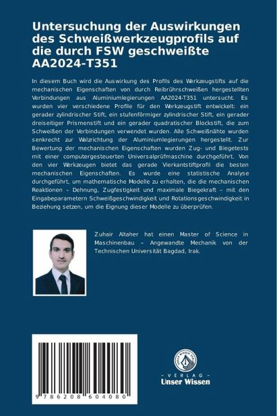 In diesem Buch wird die Auswirkung des Profils des Werkzeugstifts auf die mechanischen Eigenschaften von durch Reibrührschweißen hergestellten Verbindungen aus Aluminiumlegierungen AA2024-T351 untersucht. Es wurden vier verschiedene Profile für den Werkzeugstift entwickelt: ein gerader zylindrischer Stift, ein stufenförmiger zylindrischer Stift, ein gerader dreiseitiger Prismenstift und ein gerader quadratischer Blockstift, die zum Schweißen der Verbindungen verwendet wurden. Alle Schweißnähte wurden senkrecht zur Walzrichtung der Aluminiumlegierungen hergestellt. Zur Bewertung der mechanischen Eigenschaften wurden Zug- und Biegetests mit einer computergesteuerten Universalprüfmaschine durchgeführt. Von den vier Werkzeugen bietet das gerade Vierkantstiftprofil die besten mechanischen Eigenschaften. Es wurde eine statistische Analyse durchgeführt, um mathematische Modelle zu erhalten, die die mechanischen Reaktionen - Dehnung, Zugfestigkeit und maximale Biegekraft - mit den Eingabeparametern Schweißgeschwindigkeit und Rotationsgeschwindigkeit in Beziehung setzen, um die Eignung dieser Modelle zu überprüfen.