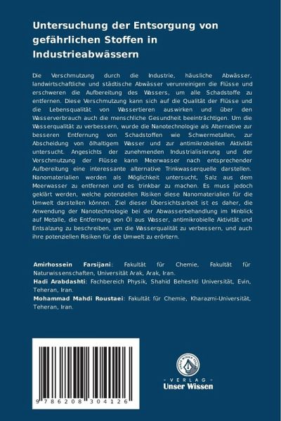 Die Verschmutzung durch die Industrie, häusliche Abwässer, landwirtschaftliche und städtische Abwässer verunreinigen die Flüsse und erschweren die Aufbereitung des Wassers, um alle Schadstoffe zu entfernen. Diese Verschmutzung kann sich auf die Qualität der Flüsse und die Lebensqualität von Wassertieren auswirken und über den Wasserverbrauch auch die menschliche Gesundheit beeinträchtigen. Um die Wasserqualität zu verbessern, wurde die Nanotechnologie als Alternative zur besseren Entfernung von Schadstoffen wie Schwermetallen, zur Abscheidung von ölhaltigem Wasser und zur antimikrobiellen Aktivität untersucht. Angesichts der zunehmenden Industrialisierung und der Verschmutzung der Flüsse kann Meerwasser nach entsprechender Aufbereitung eine interessante alternative Trinkwasserquelle darstellen. Nanomaterialien werden als Möglichkeit untersucht, Salz aus dem Meerwasser zu entfernen und es trinkbar zu machen. Es muss jedoch geklärt werden, welche potenziellen Risiken diese Nanomaterialien für die Umwelt darstellen können. Ziel dieser Übersichtsarbeit ist es daher, die Anwendung der Nanotechnologie bei der Abwasserbehandlung im Hinblick auf Metalle, die Entfernung von Öl aus Wasser, antimikrobielle Aktivität und Entsalzung zu beschreiben, um die Wasserqualität zu verbessern, und auch ihre potenziellen Risiken für die Umwelt zu erörtern.