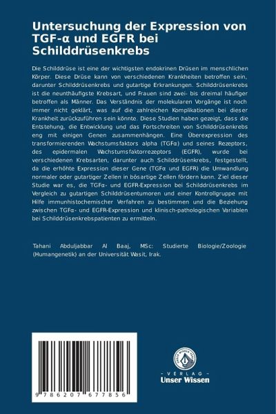 Die Schilddrüse ist eine der wichtigsten endokrinen Drüsen im menschlichen Körper. Diese Drüse kann von verschiedenen Krankheiten betroffen sein, darunter Schilddrüsenkrebs und gutartige Erkrankungen. Schilddrüsenkrebs ist die neunthäufigste Krebsart, und Frauen sind zwei- bis dreimal häufiger betroffen als Männer. Das Verständnis der molekularen Vorgänge ist noch immer nicht geklärt, was auf die zahlreichen Komplikationen bei dieser Krankheit zurückzuführen sein könnte. Diese Studien haben gezeigt, dass die Entstehung, die Entwicklung und das Fortschreiten von Schilddrüsenkrebs eng mit einigen Genen zusammenhängen. Eine Überexpression des transformierenden Wachstumsfaktors alpha (TGF ) und seines Rezeptors, des epidermalen Wachstumsfaktorrezeptors (EGFR), wurde bei verschiedenen Krebsarten, darunter auch Schilddrüsenkrebs, festgestellt, da die erhöhte Expression dieser Gene (TGF und EGFR) die Umwandlung normaler oder gutartiger Zellen in bösartige Zellen fördern kann. Ziel dieser Studie war es, die TGF - und EGFR-Expression bei Schilddrüsenkrebs im Vergleich zu gutartigen Schilddrüsentumoren und einer Kontrollgruppe mit Hilfe immunhistochemischer Verfahren zu bestimmen und die Beziehung zwischen TGF - und EGFR-Expression und klinisch-pathologischen Variablen bei Schilddrüsenkrebspatienten zu ermitteln.