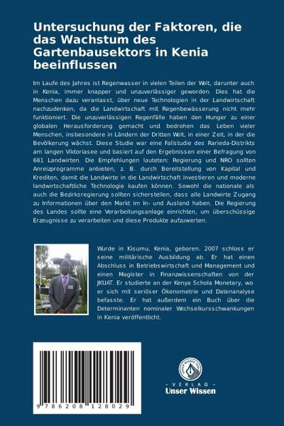 Im Laufe des Jahres ist Regenwasser in vielen Teilen der Welt, darunter auch in Kenia, immer knapper und unzuverlässiger geworden. Dies hat die Menschen dazu veranlasst, über neue Technologien in der Landwirtschaft nachzudenken, da die Landwirtschaft mit Regenbewässerung nicht mehr funktioniert. Die unzuverlässigen Regenfälle haben den Hunger zu einer globalen Herausforderung gemacht und bedrohen das Leben vieler Menschen, insbesondere in Ländern der Dritten Welt, in einer Zeit, in der die Bevölkerung wächst. Diese Studie war eine Fallstudie des Rarieda-Distrikts am langen Viktoriasee und basiert auf den Ergebnissen einer Befragung von 681 Landwirten. Die Empfehlungen lauteten: Regierung und NRO sollten Anreizprogramme anbieten, z. B. durch Bereitstellung von Kapital und Krediten, damit die Landwirte in die Landwirtschaft investieren und moderne landwirtschaftliche Technologie kaufen können. Sowohl die nationale als auch die Bezirksregierung sollten sicherstellen, dass alle Landwirte Zugang zu Informationen über den Markt im In- und Ausland haben. Die Regierung des Landes sollte eine Verarbeitungsanlage einrichten, um überschüssige Erzeugnisse zu verarbeiten und diese Produkte aufzuwerten.