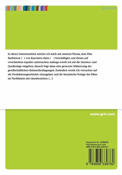 Essay aus dem Jahr 2011 im Fachbereich Orientalistik / Sinologie - Japanologie, Note: 1,7, Humboldt-Universität zu Berlin, Sprache: Deutsch, Abstract: In dieser Semesterarbeit möchte ich mich mit meinem Thema, dem Film Rashômon ( ) von Kurosawa Akira ( ) beschäftigen und diesen auf verschiedene Aspekte untersuchen. Anfangs werde ich auf die Literatur- und Quellenlage eingehen, danach folgt dann eine genauere Erläuterung der gesellschaftlichen Rahmenbedingungen. Zusätzlich werde ich versuchen auf die Produktionsgeschichte einzugehen und die literarische Vorlage des Films im Nachhinein mit einzubeziehen. Folgen wird die inhaltliche Struktur des Films, sowie die Herausarbeitung der Symbolik welche in Rashômon vielfach verwendet worden ist. Nachdem ich das genauer dargestellt habe, werde ich versuche auf die Aufführung einzugehen und anschließend die Rezeption des Films genauer darlegen. Abschließend zu meinem Essay wird dann auf die gesellschaftlichen Bezüge eingegangen.