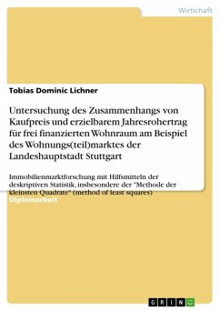 Diplomarbeit aus dem Jahr 2008 im Fachbereich BWL - Investition und Finanzierung, Note: 1,0, Université de Fribourg - Universität Freiburg (Schweiz) (Institut für Allgemeine Wirtschaftsforschung, Abteilung für Empirische Wirtschaftsforschung und Ökonometrie), Veranstaltung: Einführung in die deskriptive Statistik; Immobilienmanagement, Sprache: Deutsch, Abstract: In der Praxis eines Maklerbüros kommt es immer wieder vor, daß potentielle Kapitalanleger, welche sich zwar über die Lage der Immobilie schon Gedanken gemacht haben, aber sich über Größe, Baujahr, Ausstattung, etc. unschlüssig sind, hier eine eingehende Beratung wünschen. Aus Erfahrungswerten können hier auch Aussagen über die Vor- und Nachteile in der Vermietung verschieden großer Wohnungen gemacht werden. Es können weiter Aussagen über verschiedene Baujahrs- und Ausstattungsgruppen, die der Markt wünscht, getroffen werden. Das aktuelle Marktgeschehen jedoch, gibt der Immobilienberater - wenn in kleineren Unternehmen keine eigene Researchabteilung zur Verfügung steht - meist nur aufgrund eigener Marktbeobachtung bzw. -erfahrung wieder.Ziel der vorliegenden Arbeit ist es:Am Beispiel eines "fiktiven Investors"- das Marktgeschehen des Wohnungs(teil)marktes Stuttgart näher zuuntersuchen- das Vorliegen einer Korrelation von Kaufpreis und erzielbaremJahresrohertrag zu prüfen- Wohnungen verschiedener Größe und Baujahrsgruppe hinsichtlichKaufpreisen und Jahresroherträgen miteinander mittelsRegressionsanalyse zu vergleichen- die Ergebnisse zu interpretieren- und für den "fiktiven Investor" eine Empfehlung abzugebenGutachten, Prof. Dr. xxx (Albert-Ludwigs-Universität Freiburg im Breisgau):"Nach einer einleitenden Darstellung des Untersuchungsziels konkretisiert Tobias Lichner die Fragestellung anhand der Konstruktion eines "fiktiven Investors". Danach stellt er kurz den Wohnungsmarkt in Stuttgart vor und beschreibt den Zusammenhang zwischen Kaufpreis und Rohertrag. In Kapitel 5 diskutiert Lichner die Datenlage, führt die Regressionsanalyse durch, stellt die Ergebnisse vor und interpretiert diese im Hinblick auf seine Fragestellung...Ich schlage die Arbeit für den DIA-Preis vor."