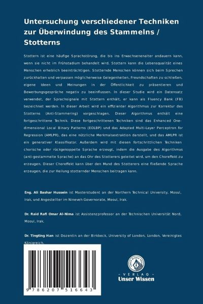 Stottern ist eine häufige Sprachstörung, die bis ins Erwachsenenalter andauern kann, wenn sie nicht im Frühstadium behandelt wird. Stottern kann die Lebensqualität eines Menschen erheblich beeinträchtigen. Stotternde Menschen können sich beim Sprechen zurückhalten und verpassen möglicherweise Gelegenheiten, Freundschaften zu schließen, eigene Ideen und Meinungen in der Öffentlichkeit zu präsentieren und Bewerbungsgespräche negativ zu beeinflussen. In dieser Studie wird ein Datensatz verwendet, der Sprachsignale mit Stottern enthält, er kann als Fluency Bank (FB) bezeichnet werden. In dieser Arbeit wird ein effizienter Algorithmus zur Korrektur des Stotterns (Anti-Stammering) vorgeschlagen. Dieser Algorithmus enthält eine fortgeschrittene Technik. Diese fortgeschrittenen Techniken sind das Enhanced One-dimensional Local Binary Patterns (EOLBP) und das Adapted Multi-Layer Perceptron for Regression (AMLPR), das eine nützliche Merkmalsextraktion darstellt, und das AMLPR ist ein generativer Klassifikator. Außerdem wird mit diesen fortschrittlichen Techniken chorische oder rückgekoppelte Sprache erzeugt, indem die Ausgabe des Algorithmus (anti-gestammelte Sprache) an das Ohr des Stotterers geleitet wird, um den Choreffekt zu erzeugen. Dieser Choreffekt kann über den Mund des Stotterers eine fließende Sprache erzeugen, die zur Heilung stotternder Menschen beitragen kann.