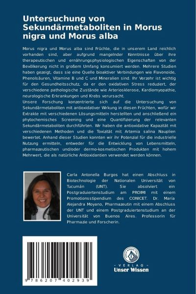 Morus nigra und Morus alba sind Früchte, die in unserem Land reichlich vorhanden sind, aber aufgrund mangelnder Kenntnisse über ihre therapeutischen und ernährungsphysiologischen Eigenschaften von der Bevölkerung nicht in großem Umfang konsumiert werden. Mehrere Studien haben gezeigt, dass sie eine Quelle bioaktiver Verbindungen wie Flavonoide, Phenolsäuren, Vitamine B und C und Mineralien sind. Ihr Verzehr ist wichtig für den Gesundheitsschutz, da er den oxidativen Stress reduziert, der verschiedene pathologische Zustände wie Arteriosklerose, Kardiomyopathie, neurologische Erkrankungen und Krebs verursacht.Unsere Forschung konzentrierte sich auf die Untersuchung von Sekundärmetaboliten mit antioxidativer Wirkung in diesen Früchten, wofür wir Extrakte mit verschiedenen Lösungsmitteln herstellten und anschließend ein phytochemisches Screening und eine Quantifizierung der relevanten Sekundärmetaboliten durchführten. Wir haben die antioxidative Kapazität mit verschiedenen Methoden und die Toxizität mit Artemia salina Nauplien bewertet. Anhand dieser Studien konnten wir ihr Potenzial für die industrielle Nutzung ermitteln, entweder für die Entwicklung von Lebensmitteln, pharmazeutischen und/oder dermo-kosmetischen Produkten mit hohem Mehrwert, die als natürliche Antioxidantien verwendet werden können.