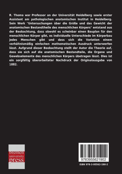 R. Thoma war Professor an der Universität Heidelberg sowie erster Assistent am pathologischen anatomischen Institut in Heidelberg. Sein Werk \"Untersuchungen über die Größe und das Gewicht der anatomischen Bestandtheile des menschlichen Körpers\" entstand aus der Beobachtung, dass obwohl es scheinbar einen Bauplan für den menschlichen Körper gibt, es individuelle Unterschiede im Körperbau jedes Menschen gibt und dass sich die Variation einem verhältnismäßig einfachen mathematischen Ausdruck unterwerfen lässt. Aufgrund dieser Beobachtung stellt der Autor die Theorie auf, dass sie sich auf die anatomischen Bestandteile, die Organe und Gewebselemente des menschlichen Körpers übetragen lässt. Dies ist ein sorgfältig überarbeiteter Nachdruck der Originalausgabe von 1882.