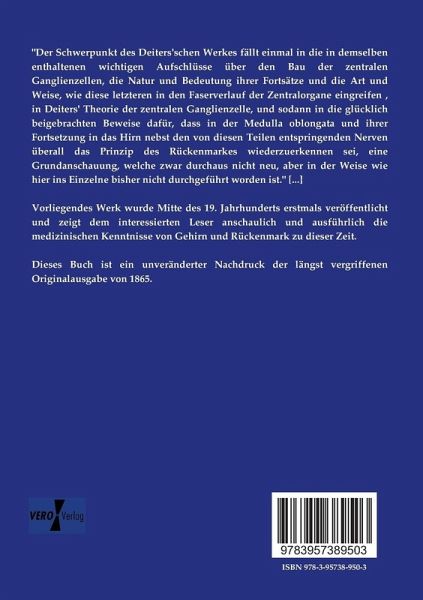 "Der Schwerpunkt des Deiters'schen Werkes fällt einmal in die in demselben enthaltenen wichtigen Aufschlüsse über den Bau der zentralen Ganglienzellen, die Natur und Bedeutung ihrer Fortsätze und die Art und Weise, wie diese letzteren in den Faserverlauf der Zentralorgane eingreifen , in Deiters' Theorie der zentralen Ganglienzelle, und sodann in die glücklich beigebrachten Beweise dafür, dass in der Medulla oblongata und ihrer Fortsetzung in das Hirn nebst den von diesen Teilen entspringenden Nerven überall das Prinzip des Rückenmarkes wiederzuerkennen sei, eine Grundanschauung, welche zwar durchaus nicht neu, aber in der Weise wie hier ins Einzelne bisher nicht durchgeführt worden ist." [...]