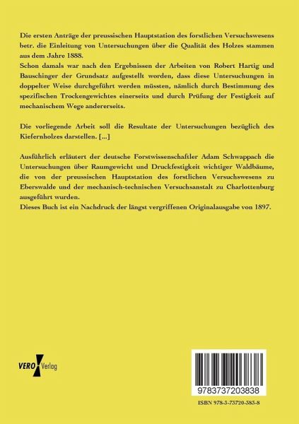 Ausführlich erläutert der deutsche Forstwissenschaftler Adam Schwappach die Untersuchungen über Raumgewicht und Druckfestigkeit wichtiger Waldbäume, die von der preussischen Hauptstation des forstlichen Versuchswesens zu Eberswalde und der mechanisch-technischen Versuchsanstalt zu Charlottenburg ausgeführt wurden.