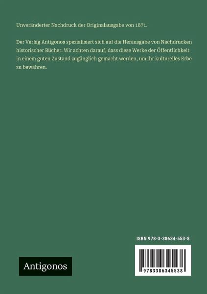 Unveränderter Nachdruck der Originalausgabe von 1871. Der Verlag Antigonos spezialisiert sich auf die Herausgabe von Nachdrucken historischer Bücher. Wir achten darauf, dass diese Werke der Öffentlichkeit in einem guten Zustand zugänglich gemacht werden, um ihr kulturelles Erbe zu bewahren.