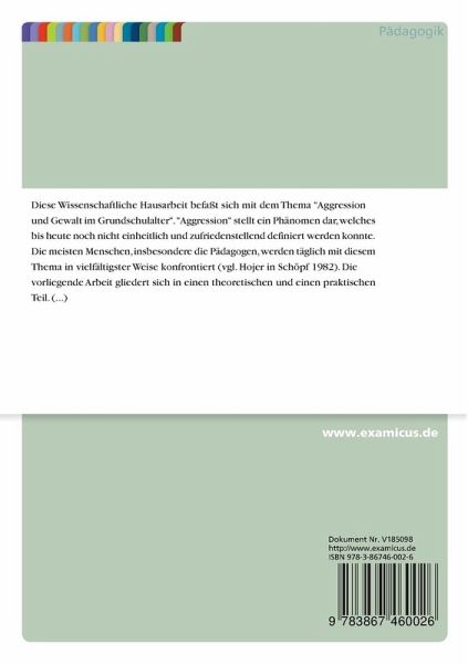 Diplomarbeit aus dem Jahr 1995 im Fachbereich Pädagogik - Pädagogische Soziologie, Note: 1, Pädagogische Hochschule Heidelberg, Sprache: Deutsch, Abstract: Diese Wissenschaftliche Hausarbeit befaßt sich mit dem Thema "Aggression und Gewalt im Grundschulalter"."Aggression" stellt ein Phänomen dar, welches bis heute noch nicht einheitlich und zufriedenstellend definiert werden konnte.Die meisten Menschen, insbesondere die Pädagogen, werden täglich mit diesem Thema in vielfältigster Weise konfrontiert (vgl. Hojer in Schöpf 1982). Die vorliegende Arbeit gliedert sich in einen theoretischen und einen praktischen Teil. Zunächst werden Definitionen der beiden grundlegenden Begriffe "Aggression" und "Gewalt" gegeben, anschließend folgt ein Überblick über die verschiedenen Aggressionstheorien.Des weiteren betrachte ich das Phänomen der Aggression unter ausgewählten entwicklungspsychologischen Aspekten.Die Entstehung von Aggression und Gewalt hat sowohl individuelle als auch gesellschaftliche Ursachen. Kinder und Jugendliche werden nicht aggressiv geboren, sondern erst die soziale Umwelt forciert solche Tendenzen (vgl. Bründel/ Hurrelmann 1994).Sie lernen durch Vorbilder in Gesellschaft und Familie, in der Schule, der Freizeit und den Medien. Diese Aggressionsfelder werden vom mir ebenfalls näherer Betrachtung unterzogen.Die Schule kann sowohl Ursache als auch Austragungsort von Aggressionen sein, die andere, äußere Ursachen haben. Aus diesem Grund gehe ich auf die Erscheinungsformen von Aggression und Gewalt im Bereich der Schule ein.