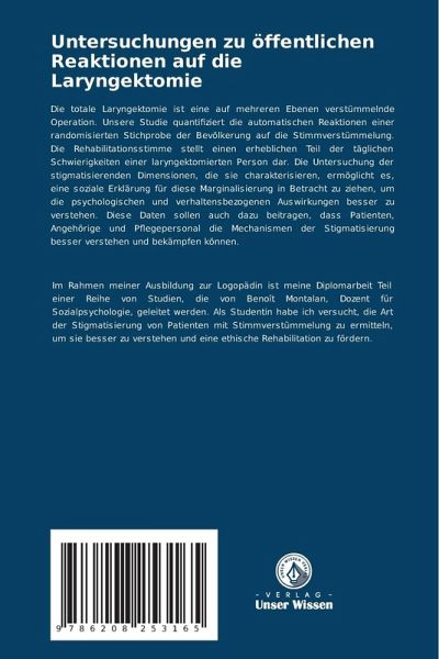 Die totale Laryngektomie ist eine auf mehreren Ebenen verstümmelnde Operation. Unsere Studie quantifiziert die automatischen Reaktionen einer randomisierten Stichprobe der Bevölkerung auf die Stimmverstümmelung. Die Rehabilitationsstimme stellt einen erheblichen Teil der täglichen Schwierigkeiten einer laryngektomierten Person dar. Die Untersuchung der stigmatisierenden Dimensionen, die sie charakterisieren, ermöglicht es, eine soziale Erklärung für diese Marginalisierung in Betracht zu ziehen, um die psychologischen und verhaltensbezogenen Auswirkungen besser zu verstehen. Diese Daten sollen auch dazu beitragen, dass Patienten, Angehörige und Pflegepersonal die Mechanismen der Stigmatisierung besser verstehen und bekämpfen können.