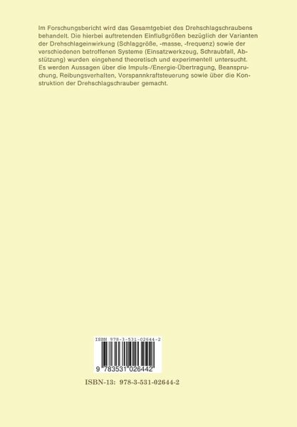Vorliegende Arbeit ist das Ergebnis van zwei Forschungsauf gaben, die vam Minister fUr Wissenschaft und Forschung des Landes Nordrhein-Westfalen gefordert wurden. Die ursprOnglichen Forschungsantrige liefen unter den nachfolgenden Titeln: a) BestiJlllllen der MeBgroBen Energle und Impuls beim Dreh schlagschraubeni Untersuchung ihres Einflusses auf die in den Schraubenverbindungen beim Anziehen bewirkte Schraubenvarspannung und auf die Schraubenbeanspruchung unter Betriebslasten. b) Untersuchung der Anziehfaktoren beim Drehschlagschrauben in ihrer Wirkung auf den Schraubvorgang und'die Schraubenverbindungen. 'Initiator der Forschungsantrage war der Verein zur Forderung von Forschungs- und Entwicklungsarbeiten in der Werkzeugindustrie e.V. Die DurchfUhrung der Versuche erfolgte im Institut fUr Werkzeugforschung, Remscheid. Die Mitarbeit der einschlagigen Werkzeug-Drehschlagschrauber firmen sowie des Fachverbandes Werkzeugindustrie e.V. sei an dieser Stelle auch erwihnt. Durch die Zusammenfassung der zwei Forschungsberichte wird das Gesamtgebiet Drehschlagschrauben erstmals in der Literatur geschlossen erfaBt. ZUr Abrundung der Forschungsergebnisse wurde die gesamte Patent- und Zeitschriftenliteratur ausge wertet, so daB der Bericht in etwa den augenblicklichen Erkenntnisstand beim Drehschlagschrauben umfaBt.