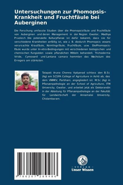 Die Forschung umfasste Studien über die Phomopsisfäule und Fruchtfäule von Auberginen und deren Management in der Region Gwalior, Madhya Pradesh. Die potenzielle Kulturpflanze ist dafür bekannt, dass sie für verschiedene Krankheiten anfällig ist, wie z. B. diedurch Phomopsis vexans verursachte Krautfäule, Keimlingsfäule, Fruchtfäule, usw. DiePhomopsis-Fäule wurde unter In-vitro-Bedingungen mit verschiedenen biologischen und chemischen Fungiziden sowie pflanzlichen Mitteln behandelt. Trichoderma Viride, Cymoxanil und Lantana camara hemmten das Wachstum des Erregers am stärksten.
