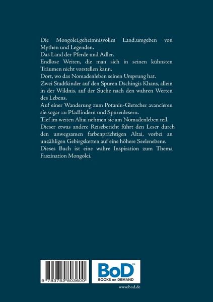 Die Mongolei, geheimnisvolles Land, umgeben von Mythen und Legenden. Das Land der Pferde und Adler.Endlose Weiten, die man sich in seinen kühnsten Träumen nicht vorstellen kann. Dort, wo das Nomadenleben seinen Ursprung hat.Zwei Stadtkinder auf den Spuren Dschingis Khans, allein in der Wildnis, auf der Suche nach den wahren Werten des Lebens.Auf einer Wanderung zum Potanin-Gletscher avancieren sie sogar zu Pfadfindern und Spurenlesern.Tief im weiten Altai nehmen sie am Nomadenleben teil.Dieser etwas andere Reisebericht führt den Leser durch den unwegsamen, farbenprächtigen Altai, vorbei an unzähligen Gebirgsketten auf eine höhere Seelenebene.Dieses Buch ist eine wahre Inspiration zum Thema Faszination Mongolei.