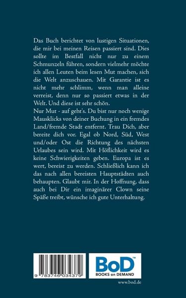 Das Buch berichtet von lustigen Situationen, die mir bei meinen Reisen passiert sind. Dies sollte im Bestfall nicht nur zu einem Schmunzeln führen, sondern vielmehr möchte ich allen Leuten beim lesen Mut machen, sich die Welt anzuschauen. Mit Garantie ist es nicht mehr schlimm, wenn man alleine verreist, denn nur so passiert etwas in der Welt. Und diese ist sehr schön.Nur Mut - auf geht's. Du bist nur noch wenige Mausklicks von deiner Buchung in ein fremdes Land/fremde Stadt entfernt. Trau Dich, aber bereite dich vor. Egal ob Nord, Süd, West und/oder Ost die Richtung des nächsten Urlaubes sein wird. Mit Höflichkeit wird es keine Schwierigkeiten geben. Europa ist es wert, bereist zu werden. Schließlich kann ich das nach allen bereisten Hauptstädten auch behaupten. Glaubt mir. In der Hoffnung, dass auch bei Dir ein imaginärer Clown seine Späße treibt, wünsche ich gute Unterhaltung.
