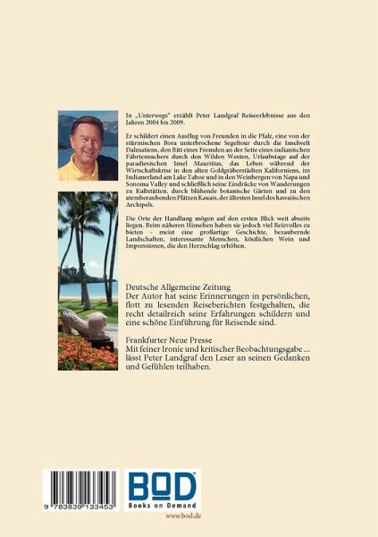 In "Unterwegs" schildert Peter Landgraf einen Ausflug von Freunden in die Pfalz, eine von der stürmischen Bora unterbrochene Segeltour durch die Inselwelt Dalmatiens, den Ritt eines Fremden an der Seite eines indianischen Fährtensuchers durch den Wilden Westen, Urlaubstage auf der paradiesischen Insel Mauritius, das Leben während der Wirtschaftskrise in den alten Goldgräberstädten Kaliforniens, im Indianerland am Lake Tahoe und in den Weinbergen von Napa und Sonoma Valley und schließlich seine Eindrücke von Wanderungen zu Kultstätten, durch botanische Gärten und zu den atemberaubenden Plätzen Kauais, der ältesten Insel des hawaiischen Archipels.