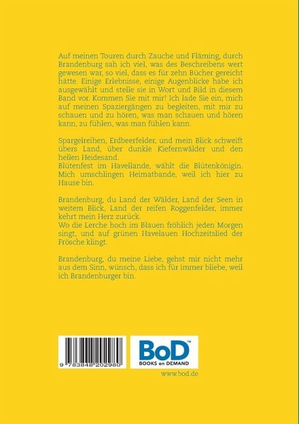 Auf meinen Touren durch Zauche und Fläming, durch Brandenburg sah ich viel, was des Beschreibens wert gewesen war, so viel, dass es für zehn Bücher gereicht hätte. Einige Erlebnisse und Erinnerungen, einige Augenblicke habe ich ausgewählt und stelle sie in Wort und Bild in diesem Band vor.Kommen Sie mit mir! Ich lade Sie ein, mich auf meinen Spaziergängen zu begleiten, mit mir zu schauen und zu hören, was man schauen und hören kann, zu fühlen, was man fühlen kann.Spargelreihen, Erdbeerfelder, und mein Blick schweift übers Land,über dunkle Kiefernwälder und den hellen Heidesand.Blütenfest im Havellande, wählt die Blütenkönigin.Mich umschlingen Heimatbande, weil ich hier zu Hause bin.Brandenburg, du Land der Wälder, Land der Seen in weitem Blick,Land der reifen Roggenfelder, immer kehrt mein Herz zurück.Wo die Lerche hoch im Blauen fröhlich jeden Morgen singt,und auf grünen Havelauen Hochzeitslied der Frösche klingt.Wo der Mensch mit leichter Seele grüßt den Gast an seinem Tisch,und sich müht, dass ihm nichts fehle, ja, dort weil ich sicherlich.Brandenburg, du meine Liebe, gehst mir nicht mehr aus dem Sinn,wünsch, dass ich für immer bliebe, weil ich Brandenburger bin.