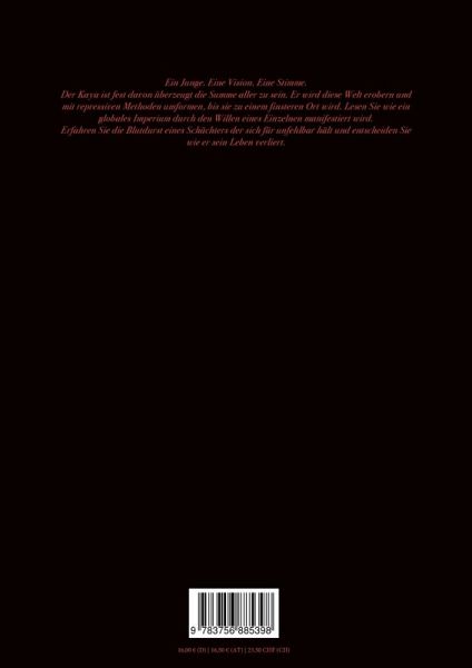 Ein Junge. Eine Vision. Eine Stimme.Der Kaya ist fest davon überzeugt die Summe aller zu sein. Er wird diese Welt erobern und mit repressiven Methoden umformen, bis sie zu einem finsteren Ort wird. Lesen Sie wie ein globales Imperium durch den Willen eines Einzelnen manifestiert wird.Erfahren Sie die Blutdurst eines Schächters der sich für unfehlbar hält und entscheiden Sie wie er sein Leben verliert.