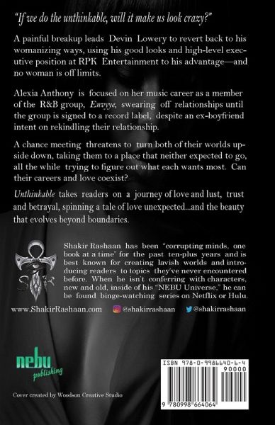 "If we do the unthinkable, would it make us look crazy?" A painful breakup leads Devin Lowery to revert back to his womanizing ways, using his good looks and high-level executive position at RPK Entertainment to his advantage-and no woman is off limits. Alexia Anthony is focused on her music career as a member of the R&B group, Envyye, swearing off relationships until the group is signed to a record label, despite an ex-boyfriend intent on rekindling their relationship. A chance meeting threatens to turn both of their worlds upside down, taking them to a place that neither expected to go, all the while trying to figure out what each wants most. Can their careers and love coexist? Unthinkable takes readers on a journey of love and lust, trust and betrayal, spinning a tale of love unexpected…and the beauty that evolves beyond boundaries.