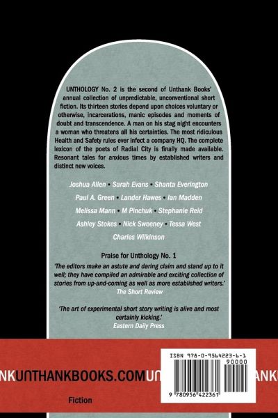 UNTHOLOGY No. 2 is the second of Unthank Books' annual collection of unpredictable, unconventional short fiction. Like its predecessor, UNTHOLOGY No. 2 showcases established writers on great form and introduces exciting new voices. Its thirteen stories depend upon choices voluntary or otherwise, incarcerations and manic episodes and moments of doubt and transcendence. A man on his stag night encounters a woman who threatens all his certainties. The most ridiculous Health and Safety rules ever infect a company HQ. The complete lexicon of the poets of Radial City is finally made available. These are resonant tales for anxious times. Contains writing by: Joshua Allen, Sarah Evans, Shanta Everington, Paul A. Green, Lander Hawes, Ian Madden, Melissa Mann, M. Pinchuk, Stephanie Reid, Ashley Stokes, Nick Sweeney, Tessa West and Charles Wilkinson.