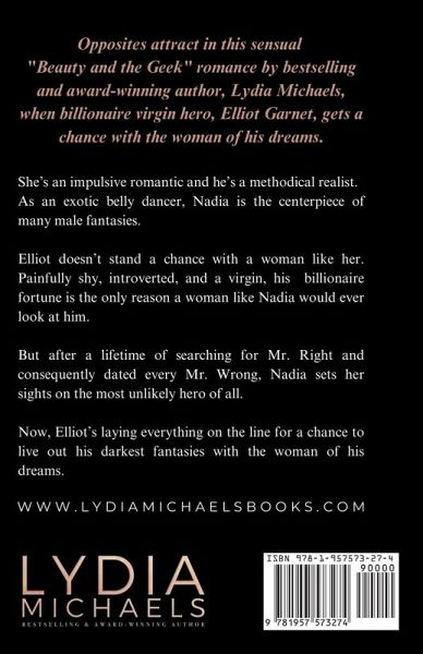 Opposites attract in this sensual "Beauty and the Geek" romance by bestselling and award-winning author Lydia Michaels when billionaire virgin hero Elliot Garnet gets a shot with the woman of his dreams. She's an impulsive romantic, and he's a methodical realist. She's an exotic belly dancer and the centerpiece of every man's fantasy. He's a painfully shy, introverted billionaire-and a virgin. She's spent her life searching for Mr. Right and consequently dated every Mr. Wrong. He's never dated anyone-never wanted to-until he met her. Elliot must lay everything on the line for a chance to live out his darkest fantasies with the woman of his dreams. He's nothing like the men Nadia usually dates, but maybe that's the secret to escaping all the Mr. Wrongs.