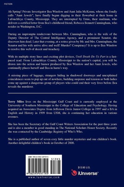 Ah Spring! Private Investigator Bea Winslow and Aunt Julia McKenna, whom she fondly calls "Aunt Jewels", have finally begun digging in their flowerbed at their home in Lafouchfeye County, Mississippi. They are interrupted by Ernie, their mailman, who delivers a certified letter from Bea's childhood friend, Rebecca Bennett Cunningham, who resides in Washington, D.C. During an impromptu rendezvous between Mrs. Cunningham, who is the wife of the Deputy Director of The Central Intelligence Agency, and a prominent Senator, she discovers him dead. Later that evening, at a soiree given by Mr. and Mrs. Cunningham, the Senator and his wife arrive alive and well! Murder? Conspiracy? It is up to Bea Winslow to resolve this web of deceit and treachery. With its multiple story lines and exciting plot devices, Until Death Do Us Part is a fast-paced read. From Lafouchfeye County, Mississippi to the nation's capital, you will be drawn into the action and humor produced by Bea Winslow and her Aunt Jewels, who continually places herself and Bea in harm's way. A missing piece of luggage, strangers hiding in shadowed doorways and unexplained coincidences seem to pop up out of nowhere, building suspense and tension as both ladies come up against a dangerous group of players who could end their very lives before Bea reveals the murderer.