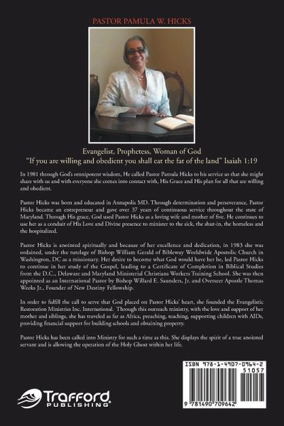Evangelist, Prophetess, Woman of God "If you are willing and obedient you shall eat the fat of the land" Isaiah 1:19 In 1981 through God's omnipotent wisdom, He called Pastor Pamula Hicks to his service so that she might share with us and with everyone she comes into contact with, His Grace and His plan for all that are willing and obedient. Pastor Hicks was born and educated in Annapolis MD. Through determination and perseverance, Pastor Hicks became an entrepreneur and gave over 37 years of continuous service throughout the state of Maryland. Through His grace, God used Pastor Hicks as a loving wife and mother of five. He continues to use her as a conduit of His Love and Divine presence to minister to the sick, the shut-in, the homeless and the hospitalized. Pastor Hicks is anointed spiritually and because of her excellence and dedication, in 1983 she was ordained, under the tutelage of Bishop William Gerald of Bibleway Worldwide Apostolic Church in Washington, DC as a missionary. Her desire to become what God would have her be, led Pastor Hicks to continue in her study of the Gospel, leading to a Certificate of Completion in Biblical Studies from the D.C., Delaware and Maryland Ministerial Christians Workers Training School. She was then appointed as an International Pastor by Bishop Willard E. Saunders, Jr. and Overseer Apostle Thomas Weeks Jr., Founder of New Destiny Fellowship. In order to fulfill the call to serve that God placed on Pastor Hicks' heart, she founded the Evangelistic Restoration Ministries Inc. International. Through this outreach ministry, with the love and support of her mother and siblings, she has traveled as far as Africa, preaching, teaching, supporting children with AIDs, providing financial support for building schools and obtaining property. Pastor Hicks has been called into Ministry for such a time as this. She displays the spirit of a true anointed servant and is allowing the operation of the Holy Ghost within her life.