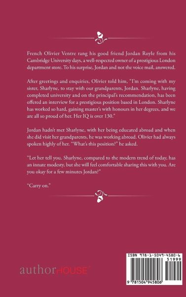 French Olivier Ventre rang his good friend Jordan Royle from his Cambridge University days, a well-respected owner of a prestigious London department store. To his surprise, Jordan and not the voice mail, answered. After greetings and enquiries, Olivier told him, "I'm coming with my sister, Sharlyne, to stay with our grandparents, Jordan. Sharlyne, having completed university and on the principal's recommendation, has been offered an interview for a prestigious position based in London. Sharlyne has worked so hard, gaining master's with honours in her degrees, and we are all so proud of her. Her IQ is over 130." Jordan hadn't met Sharlyne, with her being educated abroad and when she did visit her grandparents, he was working abroad. Olivier had always spoken highly of her. "What's this position?" he asked. "Let her tell you. Sharlyne, compared to the modern trend of today, has an innate modesty, but she will feel comfortable sharing this with you. Are you okay for a few minutes Jordan?" "Carry on."