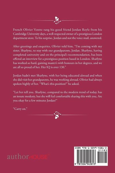 French Olivier Ventre rang his good friend Jordan Royle from his Cambridge University days, a well-respected owner of a prestigious London department store. To his surprise, Jordan and not the voice mail, answered. After greetings and enquiries, Olivier told him, "I'm coming with my sister, Sharlyne, to stay with our grandparents, Jordan. Sharlyne, having completed university and on the principal's recommendation, has been offered an interview for a prestigious position based in London. Sharlyne has worked so hard, gaining master's with honours in her degrees, and we are all so proud of her. Her IQ is over 130." Jordan hadn't met Sharlyne, with her being educated abroad and when she did visit her grandparents, he was working abroad. Olivier had always spoken highly of her. "What's this position?" he asked. "Let her tell you. Sharlyne, compared to the modern trend of today, has an innate modesty, but she will feel comfortable sharing this with you. Are you okay for a few minutes Jordan?" "Carry on."