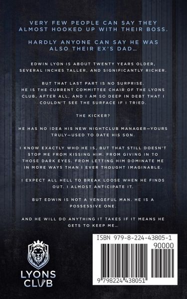 Very few people can say they almost hooked up with their boss. Hardly anyone can say he was also their ex's dad... Edwin Lyon is about twenty years older, several inches taller, and significantly richer. But that last part is no surprise. He is the CEO of the Lyons Club, after all, and I am so deep in debt that I couldn't see the surface if I tried. The kicker? He has no idea his new nightclub manager-yours truly-used to date his son. I know exactly who he is, but that still doesn't stop me from kissing him. From giving in to those dark eyes. From letting him dominate me in more ways than I ever thought imaginable. I expect all hell to break loose when he finds out. I almost anticipate it. But Edwin is not a vengeful man. He is a possessive one. And he will do anything it takes if it means he gets to keep me...
