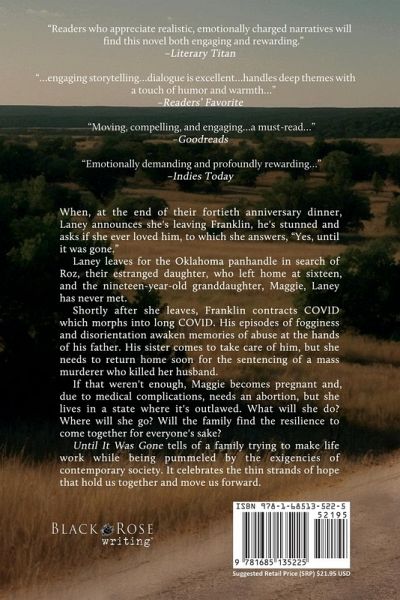 When, at the end of their fortieth anniversary dinner, Laney announces she's leaving Franklin, he's stunned and asks if she ever loved him, to which she answers, "Yes, until it was gone." Laney leaves for the Oklahoma panhandle in search of Roz, their estranged daughter, who left home at sixteen, and the nineteen-year-old granddaughter, Maggie, Laney has never met. Shortly after she leaves, Franklin contracts COVID which morphs into long COVID. His episodes of fogginess and disorientation awaken memories of abuse at the hands of his father. His sister comes to take care of him, but she needs to return home soon for the sentencing of a mass murderer who killed her husband. If that weren't enough, Maggie becomes pregnant and, due to medical complications, needs an abortion, but she lives in a state where it's outlawed. What will she do? Where will she go? Will the family find the resilience to come together for everyone's sake? Until It Was Gone tells of a family trying to make life work while being pummeled by the exigencies of contemporary society. It celebrates the thin strands of hope that hold us together and move us forward.