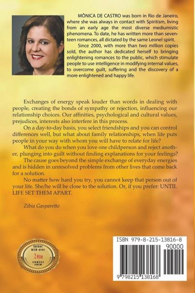 Exchanges of energy speak louder than words in dealing with people, creating the bonds of sympathy or rejection, influencing our relationship choices. Our affinities, psychological and cultural values, prejudices, interests also interfere in this process. On a day-to-day basis, you select friendships and you can control differences well, but what about family relationships, when life puts people in your way with whom you will have to relate for life? What do you do when you love one childperson and reject another, plunging into guilt without finding explanations for your feelings? The cause goes beyond the simple exchange of everyday energies and is hidden in unresolved problems from other lives that come back for a solution. No matter how hard you try, you cannot keep that person out of your life. She/he will be close to the solution. Or, if you prefer: UNTIL LIFE SET THEM APART. Zibia Gasparetto