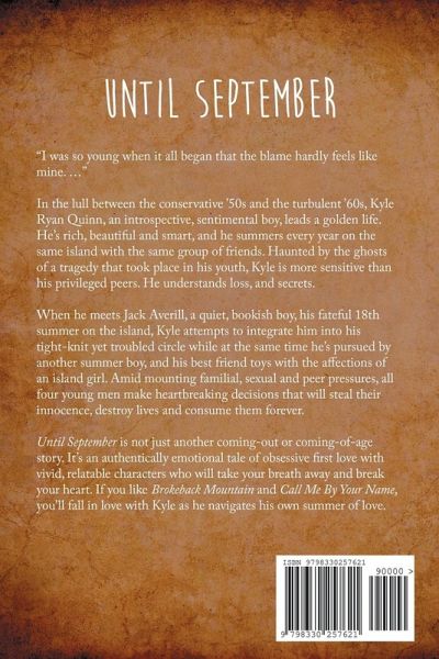 "I was so young when it all began that the blame hardly feels like mine. ..." In the lull between the conservative '50s and the turbulent '60s, Kyle Ryan Quinn, an introspective, sentimental boy, leads a golden life. He's wealthy, beautiful and smart, and he vacations each year on the same island with the same circle of friends: entitled Adonis Trent; acerbic Claudia; practical Dana; and frivolous Carly. Haunted by the ghosts of a tragedy that took place in his youth, Kyle is more sensitive than his privileged friends. He understands loss, and secrets. When he meets Jack Averill, a quiet, bookish boy, his fateful 18th summer on the island, Kyle falls hopelessly, heedlessly in love. As he befriends and attempts to woo Jack - and tries to integrate him into his tight-knit yet troubled circle - he's pursued himself by another summer boy, Trey, who will stop at nothing to win Kyle's love, all while Trent toys with the affections of an island girl. Amid mounting familial, sexual and peer pressures, all four young men make heartbreaking decisions that will steal their innocence, destroy lives and consume them forever.