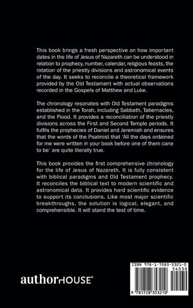 This book brings a fresh perspective on how important dates in the life of Jesus of Nazareth can be understood in relation to prophecy, number, calendar, religious feasts, the rotation of the priestly divisions and astronomical events of the day. It seeks to reconcile a theoretical framework provided by the Old Testament with actual observations recorded in the Gospels of Matthew and Luke. The chronology resonates with Old Testament paradigms established in the Torah, including Sabbath, Tabernacles, and the Flood. It provides a reconciliation of the priestly divisions across the First and Second Temple periods. It fulfils the prophecies of Daniel and Jeremiah and ensures that the words of the Psalmist that 'All the days ordained for me were written in your book before one of them cane to be' are quite literally true. This book provides the first comprehensive chronology for the life of Jesus of Nazareth. It is fully consistent with biblical paradigms and Old Testament prophecy. It reconciles the biblical text to modern scientific and astronomical data. It provides hard scientific evidence to support its conclusions. Like most major scientific breakthroughs, the solution is logical, elegant, and comprehensible. It will stand the test of time.