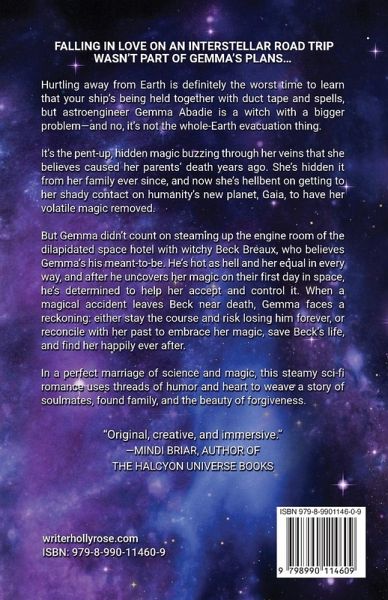 Falling in love on an interstellar road trip wasn't part of Gemma's plans... Hurtling away from Earth is definitely the worst time to learn that your ship's being held together with duct tape and spells, but astroengineer Gemma Abadie is a witch with a bigger problem-and no, it's not the whole-Earth evacuation thing. It's the pent-up, hidden magic buzzing through her veins that she believes caused her parents' death years ago. She's hidden it from her family ever since, and now she's hellbent on getting to her shady contact on humanity's new planet, Gaia, to have her volatile magic removed. But Gemma didn't count on steaming up the engine room of the dilapidated space hotel with witchy Beck Breaux, who believes Gemma's his meant-to-be. He's hot as hell and her equal in every way, and after he uncovers her magic on their first day in space, he's determined to help her accept and control it. When a magical accident leaves Beck near death, Gemma faces a reckoning: either stay the course and risk losing him forever, or reconcile with her past to embrace her magic, save Beck's life, and find her happily ever after. In a perfect marriage of science and magic, this steamy sci-fi romance uses threads of humor and heart to weave a story of soulmates, found family, and the beauty of forgiveness.