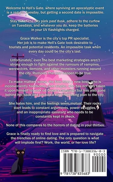 Welcome to Hell's Gate, where surviving an apocalyptic event is a regular Tuesday, but getting a second date is impossible. Stay out of the city park past dusk, adhere to the curfew on Tuesdays, and whatever you do, keep the batteries in your UV flashlights charged. Grace Walker is the city's top PR specialist. Her job is to make Hell's Gate look desirable to tourists and potential residents. An impossible task when every day could be the city's last. Unfortunately, even the best marketing strategies aren't strong enough to fight against the rumours of vampires, werewolves, demons, and other monsters running around the city. Rumours that just happen to be true. To make matters worse, the firm hires a new boss, who is inconveniently handsome, (and single), who has not only taken it upon himself to work on Grace's campaign but has also gone behind her back and pitched a new marketing plan to the city. She hates him, and the feelings seem mutual. Their rocky start leads to constant arguments, power struggles, and an inappropriate assistant who needs to be constantly kept in check. None of this compares to the horrors of dating in your thirties. Grace is finally ready to find love and is prepared to navigate the trenches of online dating. The only question is what will implode first? Work, the world, or her love life?